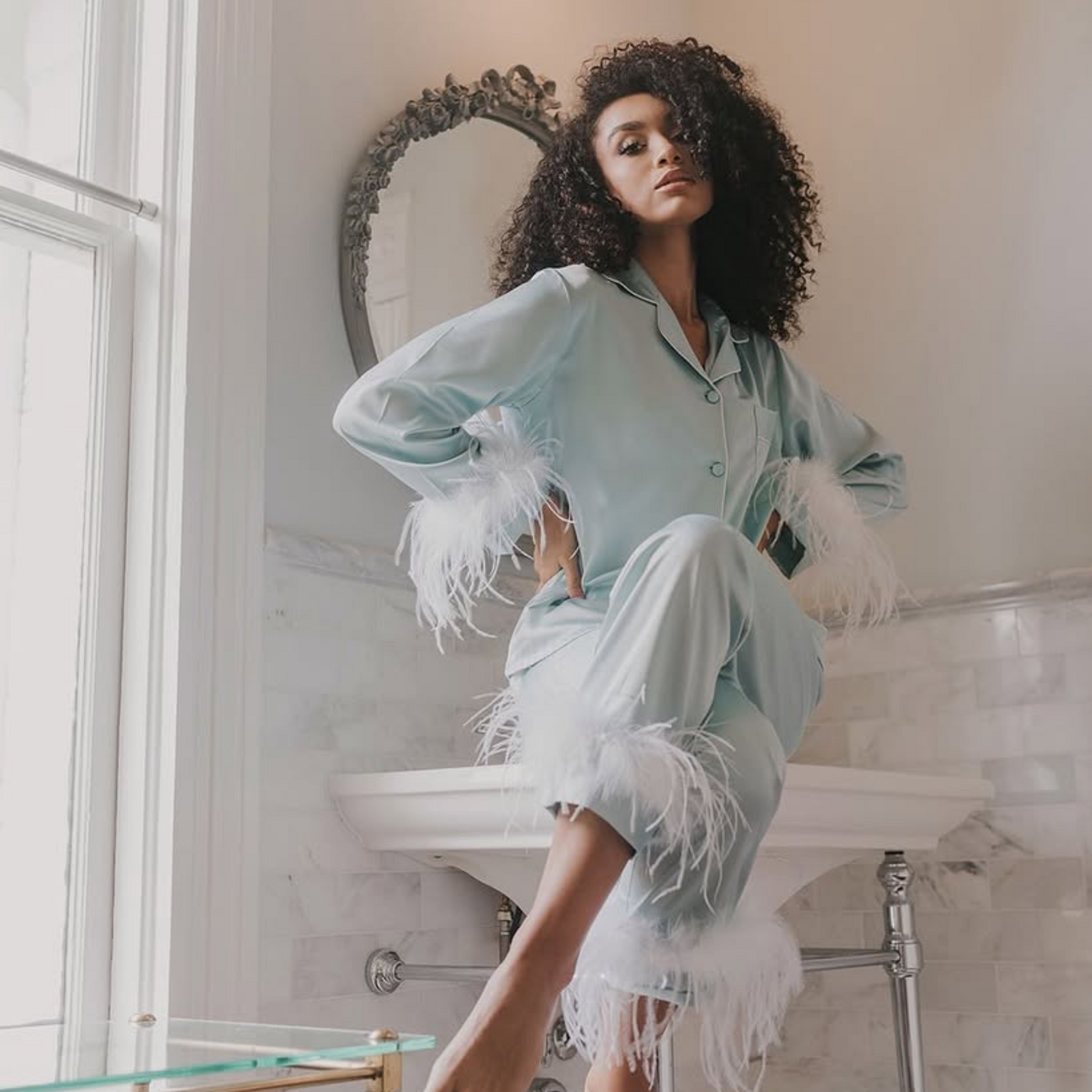Handmade to perfection and designed with you in mind. The iconic ostrich feather trimmed pajamas feature a 4-button closure and single patch pocket. An elastic band on the pants and relaxed silhouette make these perfect for evening wear and daytime lounging.