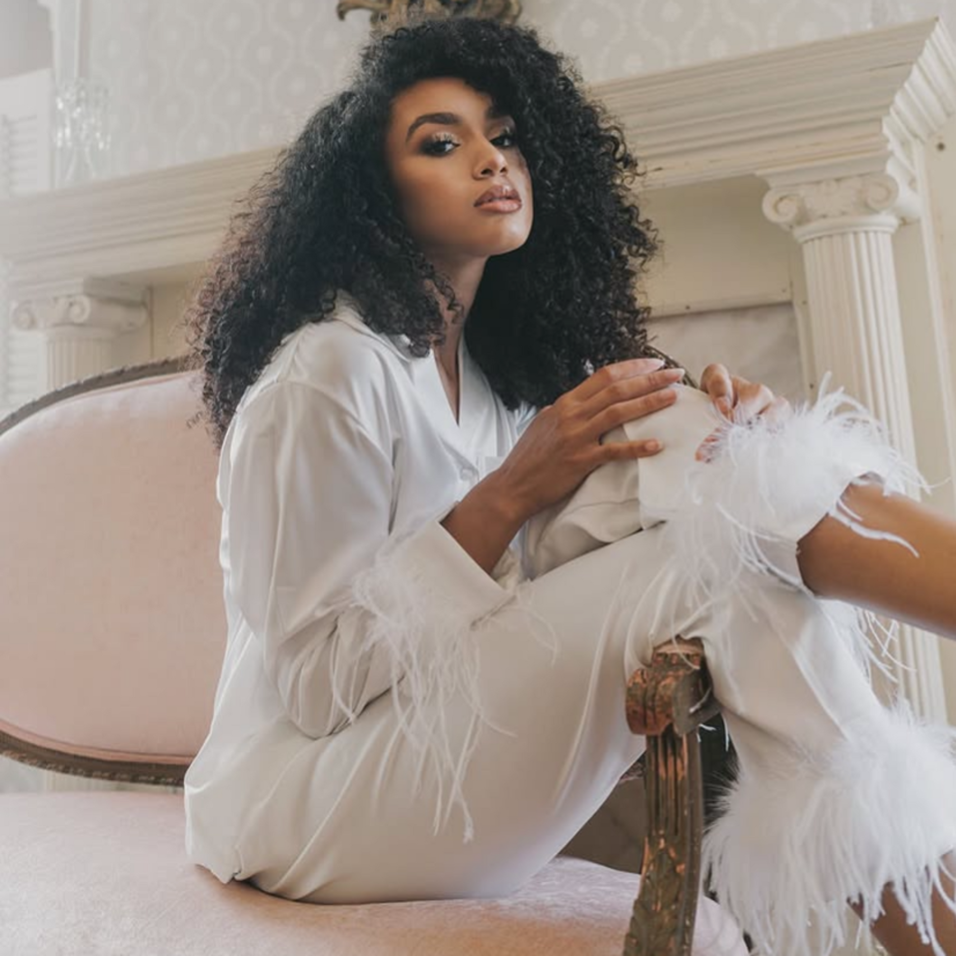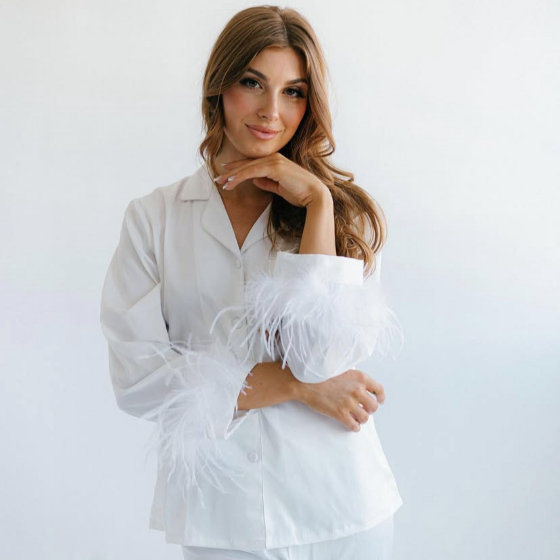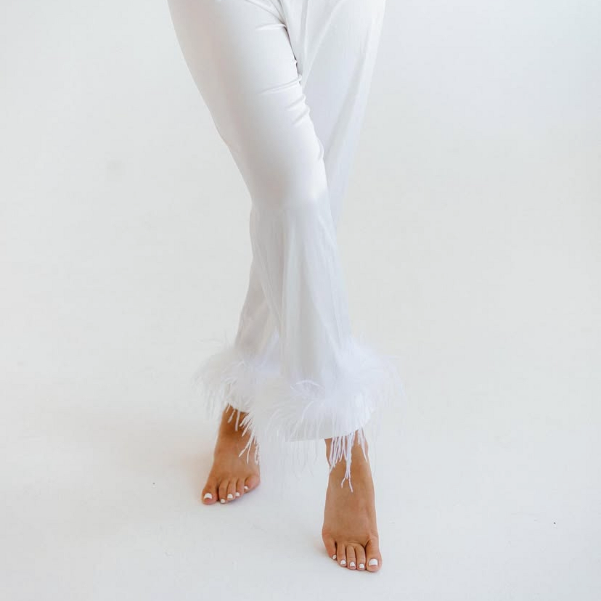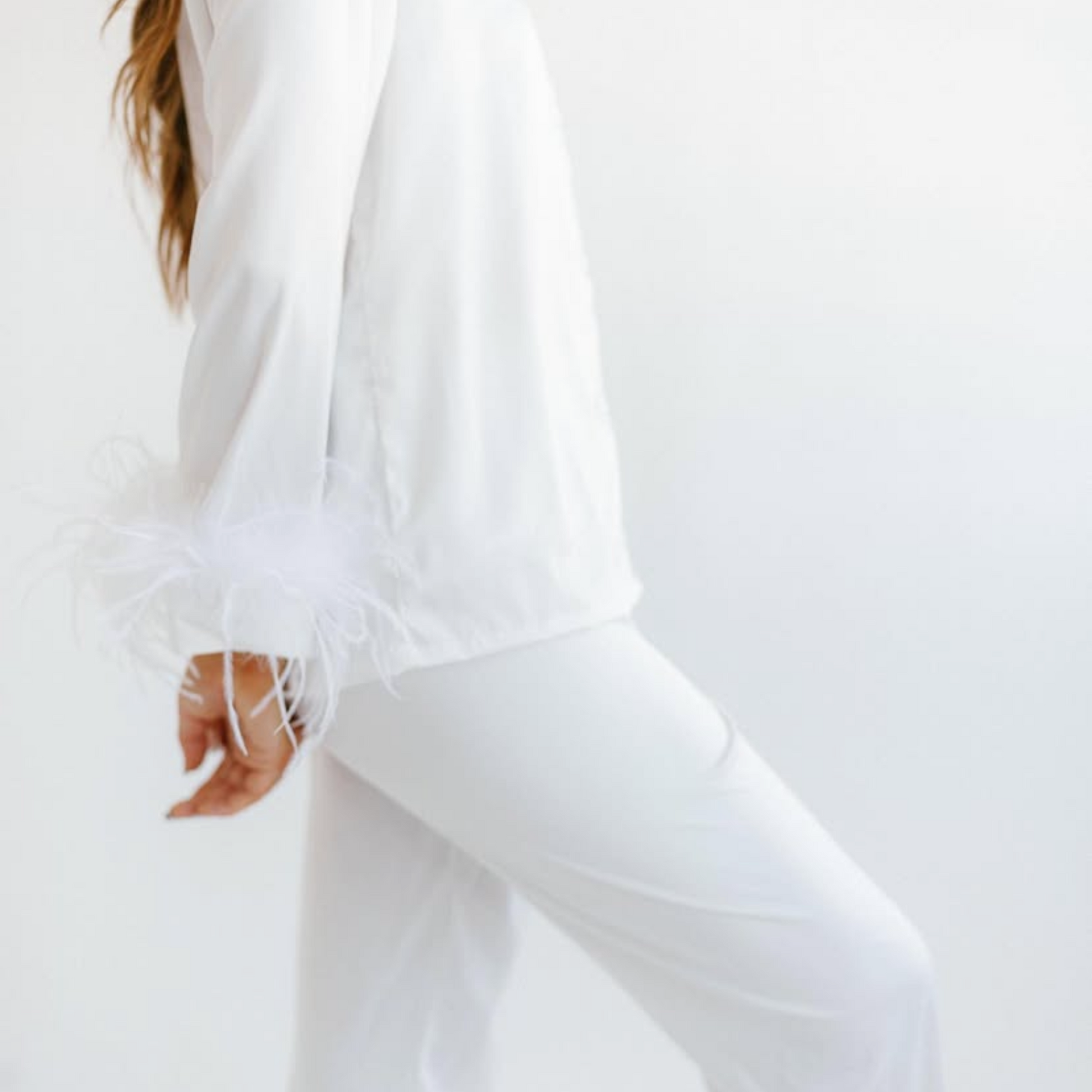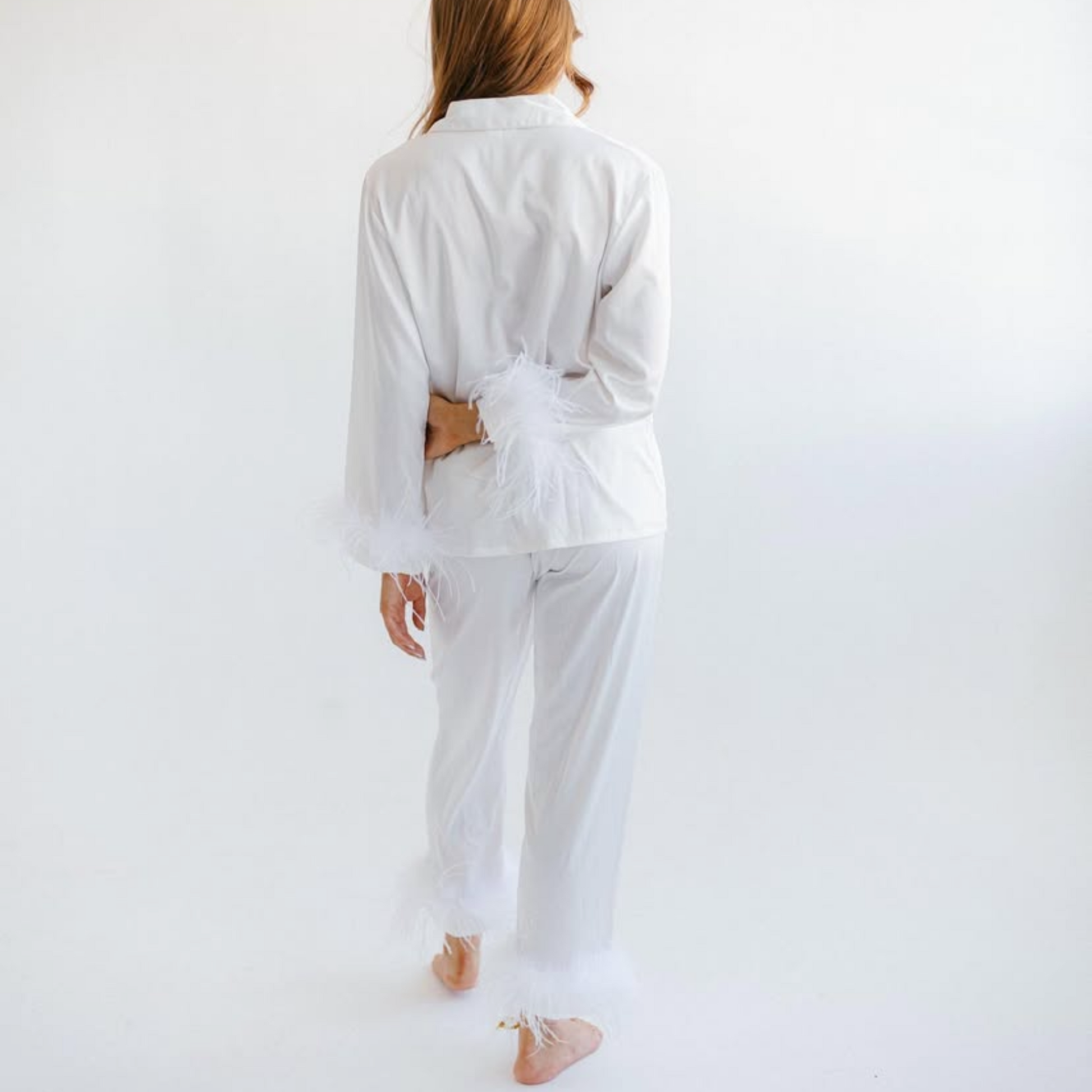 Handmade to perfection and designed with you in mind. The iconic ostrich feather trimmed pajamas feature a 4-button closure and single patch pocket. An elastic band on the pants and relaxed silhouette make these perfect for evening wear and daytime lounging.